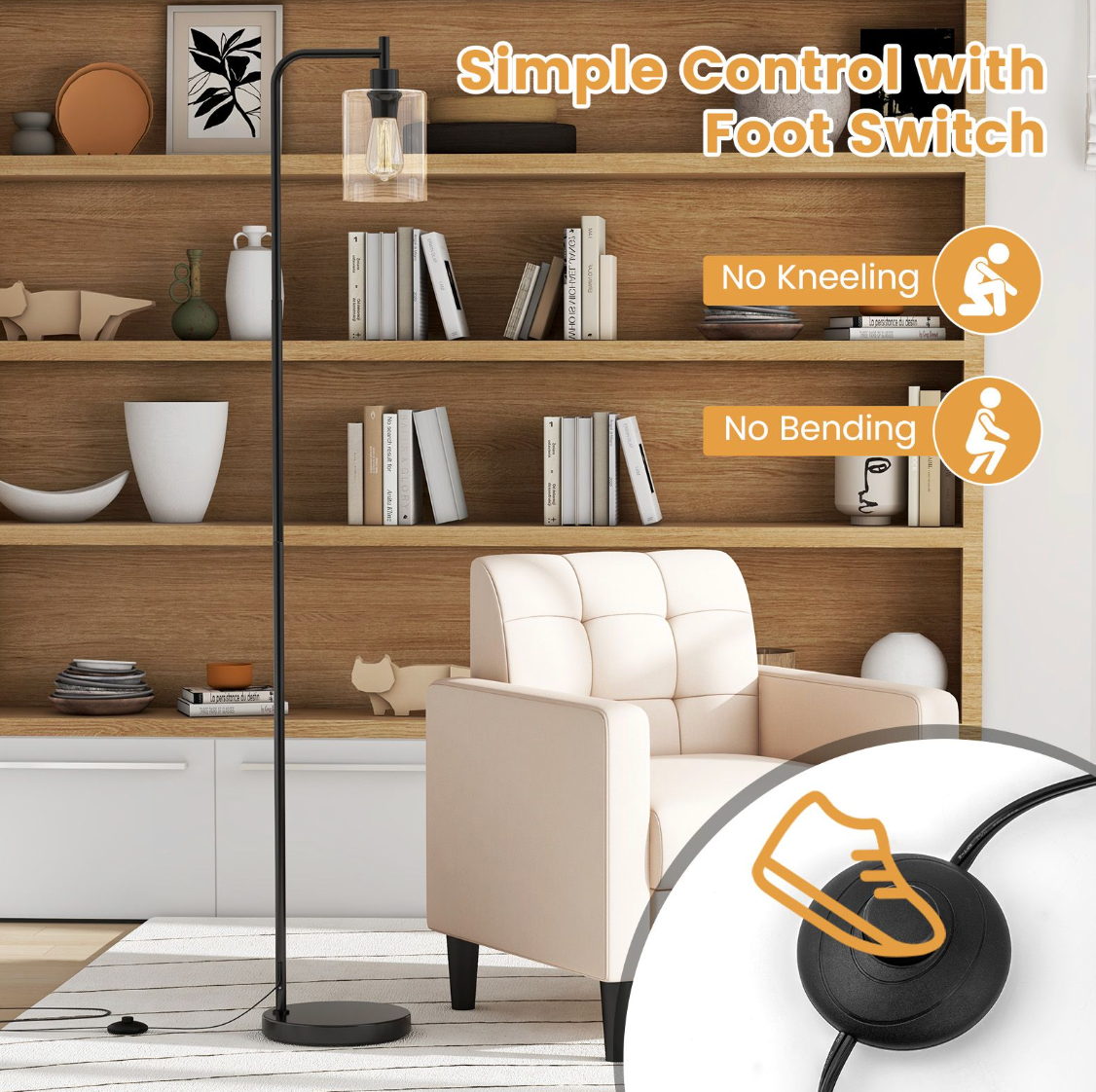 Add a touch of elegance to your home with this modern standing floor lamp, featuring a transparent hanging glass lampshade that diffuses light beautifully for a warm, sophisticated glow. Perfect for living rooms, bedrooms, or offices, it brings both functionality and style to any space. The E27 standard socket allows you to choose your preferred bulb type (not included), creating a customized lighting atmosphere. Designed for safety, the anti-tipping base has passed the 8° stability test, ensuring secure placement. Plus, the foot switch offers effortless on/off control, while the simple structure and included tools make assembly quick and easy.